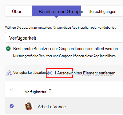 Um einen oder mehrere Benutzer oder Gruppen aus einer App zu entfernen, wählen Sie die Zeilen und dann Entfernen aus.