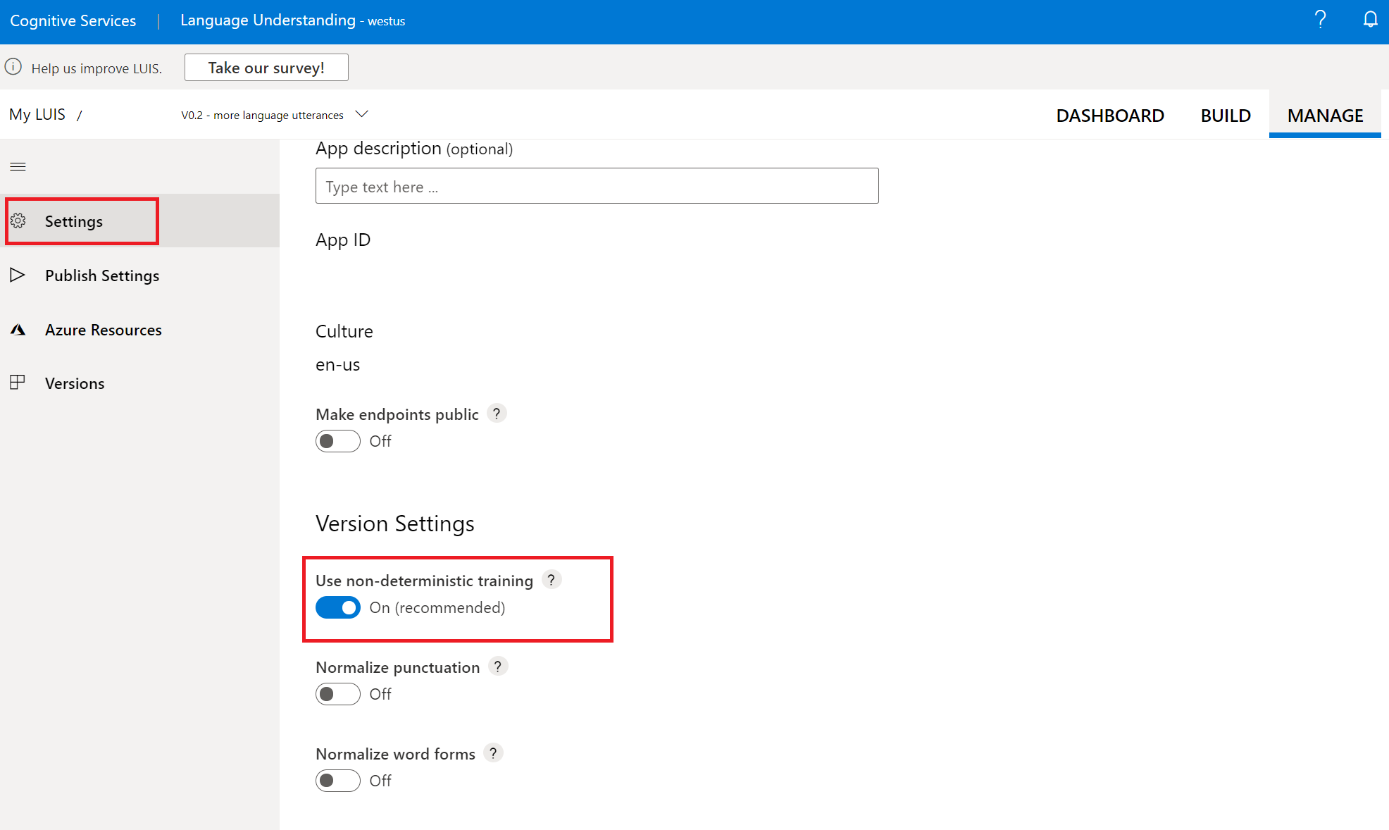 Melden Sie sich beim LUIS-Portal an, und wählen Sie Ihre App aus. Wählen Sie oben auf dem Bildschirm Verwalten und dann Einstellungen aus. Aktivieren oder deaktivieren Sie die Option Use non-deterministic training (Nicht deterministisches Training verwenden). Wenn diese Option deaktiviert ist, werden alle verfügbaren Daten im Training verwendet. Beim Training wird nur eine zufällige Stichprobe von Daten aus anderen Absichten als negative Daten verwendet, wenn jede Absicht trainiert wird.