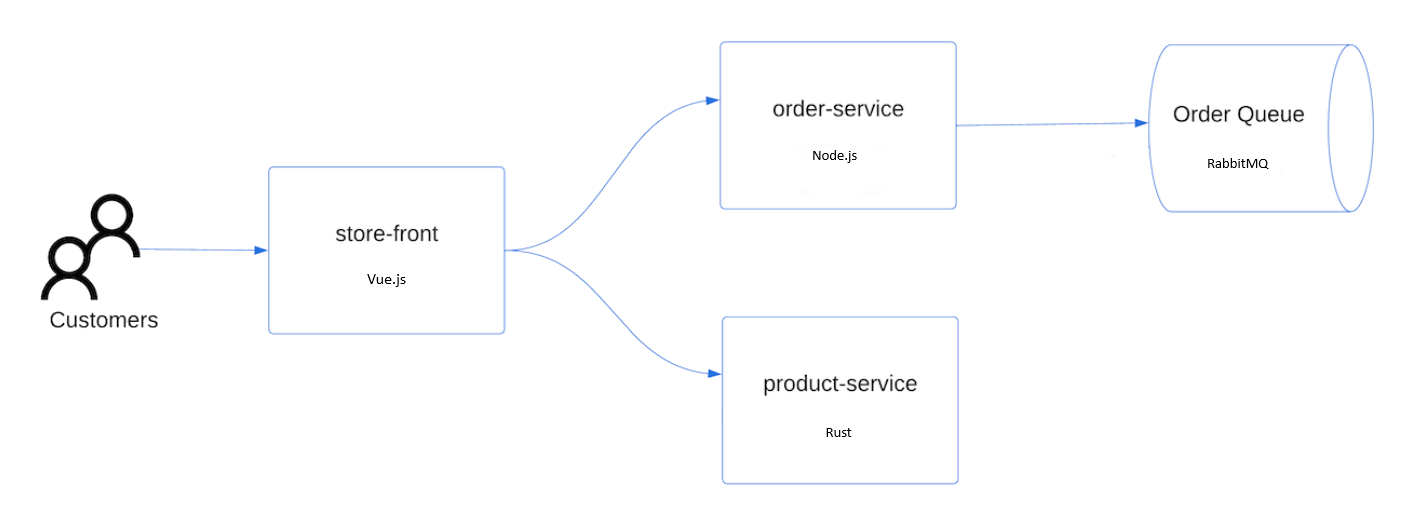 Die in diesem Tutorial verwendete Beispielanwendung ist eine einfache Store Front-App, einschließlich der folgenden Kubernetes-Bereitstellungen und -Dienste: