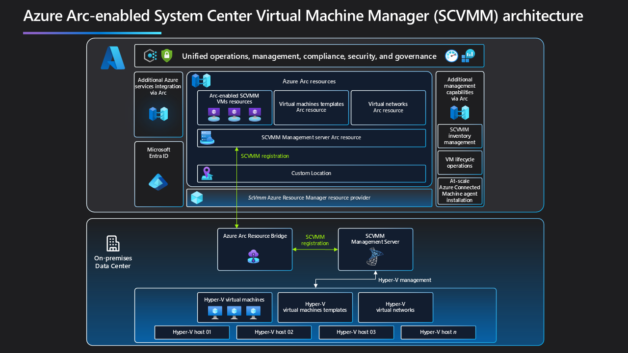 Die folgende Abbildung zeigt die Architektur für den Azure Arc-fähigen SCVMM: