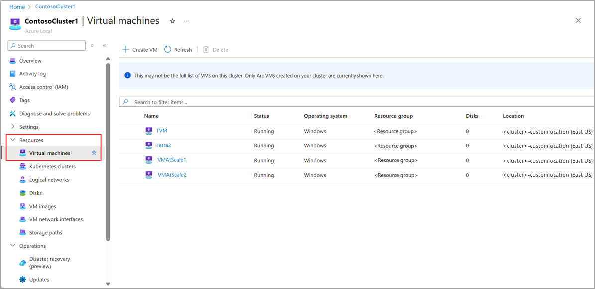 - Ein benutzerdefinierter Speicherort für Ihr Lokales Azure, den Sie zum Bereitstellen von VMs verwenden. Der benutzerdefinierte Speicherort wird auch auf der Seite "Übersicht" für Azure Local angezeigt.
