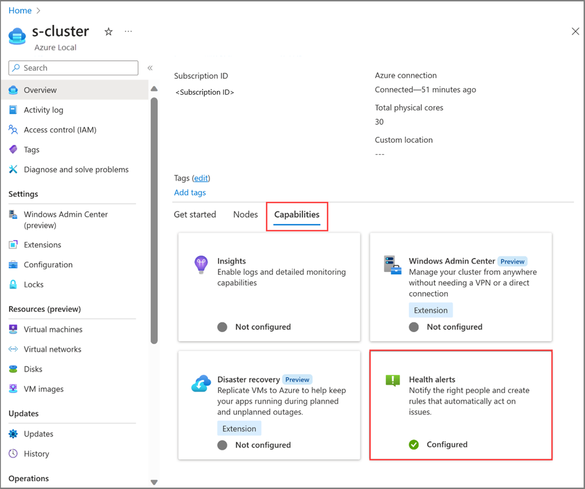 Wechseln Sie zur Ressourcenseite des lokalen Azure-Systems, und wählen Sie Ihren Cluster aus. Wählen Sie auf der Registerkarte "Funktionen" die Kachel "Gesundheitswarnungen" aus.