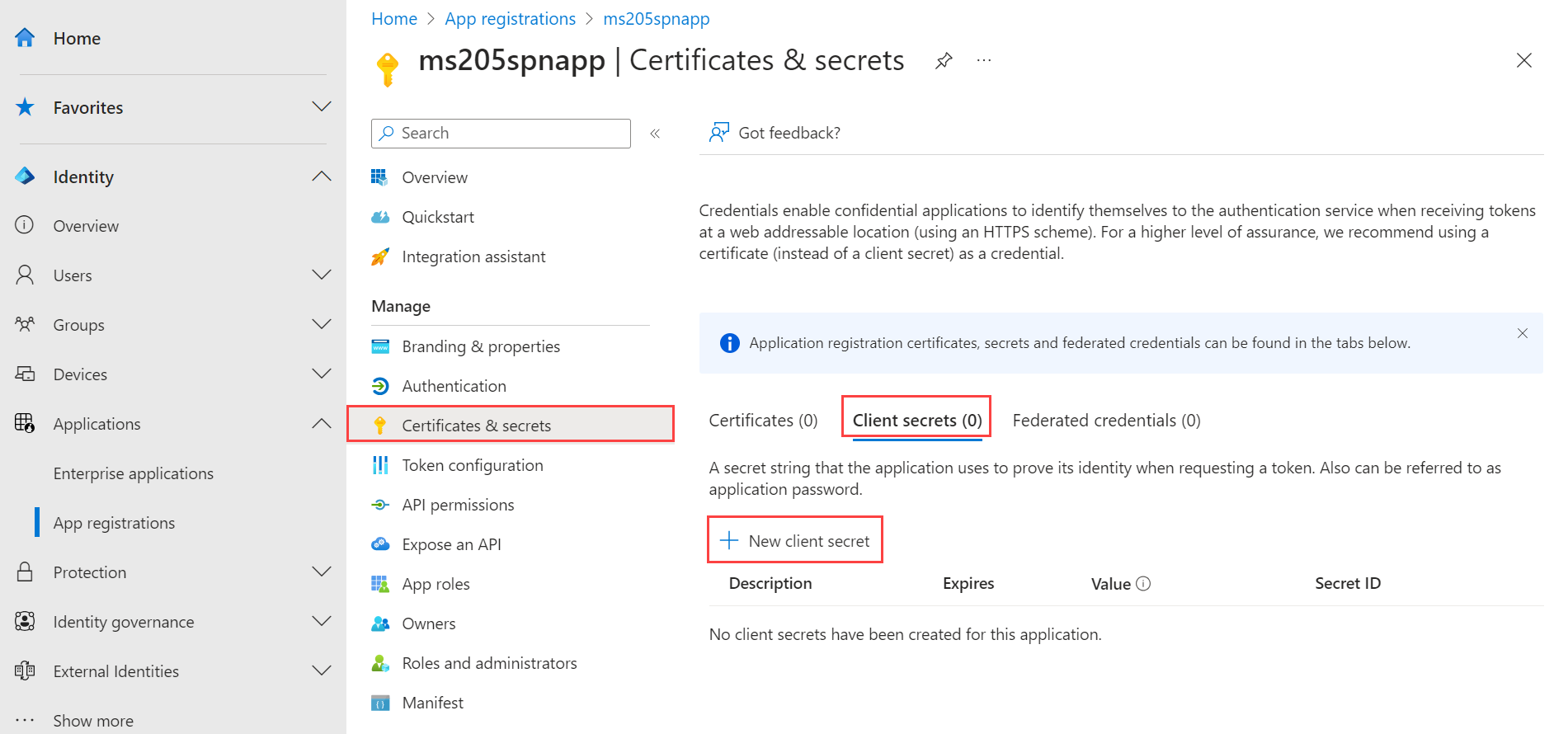 Rufen Sie die Anwendungsregistrierung auf, die Sie erstellt haben, und gehen Sie zu Zertifikate & Geheimnisse > Client-Geheimnisse.