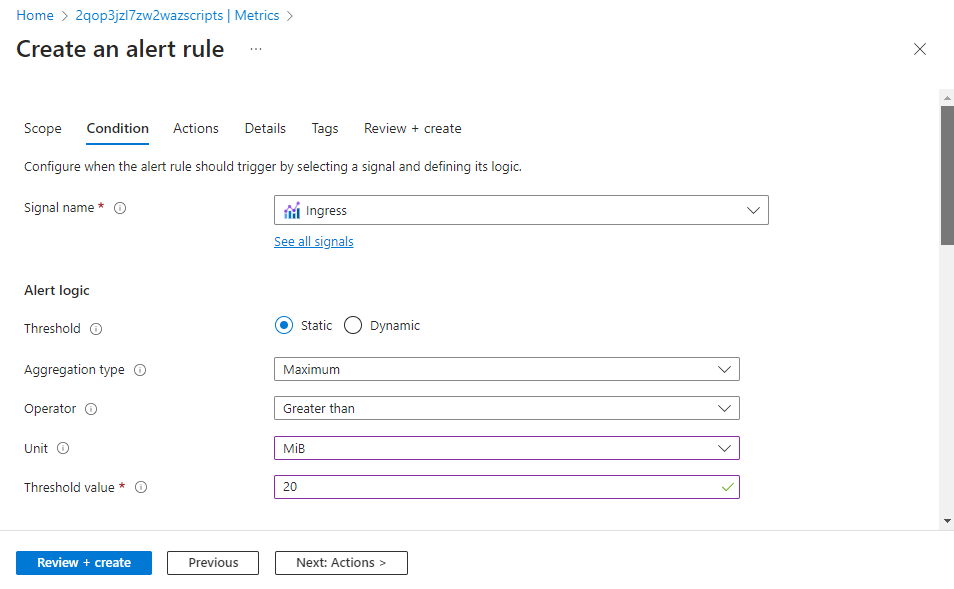 Wenn Sie die Konfiguration der Signallogik abgeschlossen haben, klicken Sie entweder auf Weiter: Aktionen > oder auf die Registerkarte Aktionen, um Aktionen zu konfigurieren.