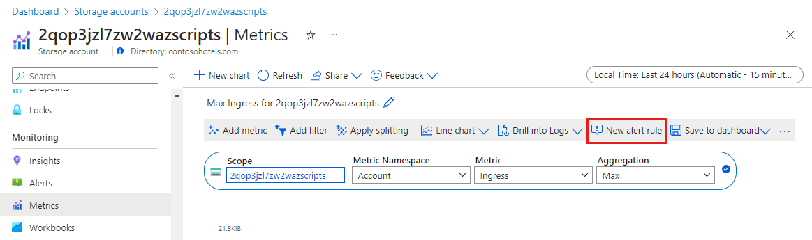 Klicken Sie im Metrik-Explorer auf Neue Warnungsregel. Die Regel wird mit dem Zielobjekt und der Metrik vorkonfiguriert, die Sie im Metrik-Explorer ausgewählt haben.