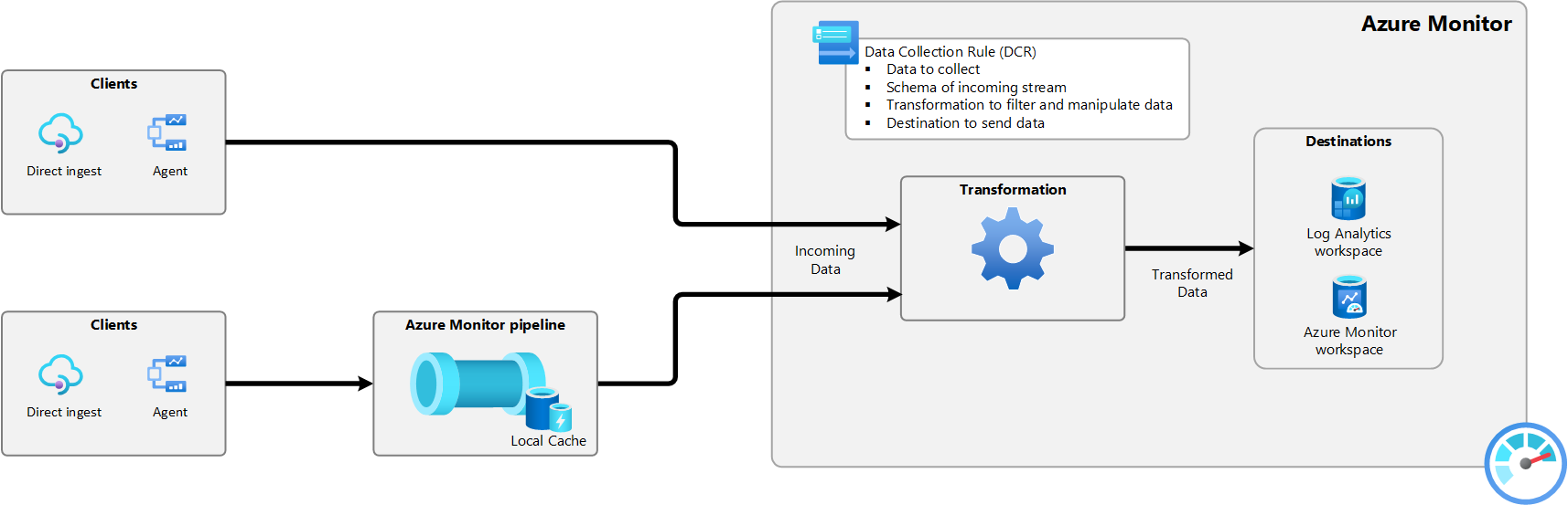 Die Azure Monitor-Pipeline erweitert den Datensammlungsprozess auf Ihr eigenes Rechenzentrum. Sie ermöglicht die Sammlung und das Routing von Telemetriedaten im großen Maßstab, bevor diese in die Cloud übermittelt werden.