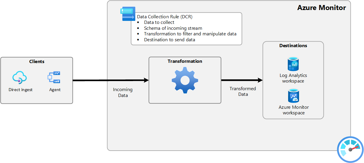 Datensammlungsregeln (Data Collection Rules, DCRs) sind Teil eines ETL-ähnlichen Prozesses (Extract, Transform und Load), der die alten Datensammlungsmethoden für Azure Monitor verbessert. Dieser Prozess verwendet eine gemeinsame Datenaufnahmestrategie für alle Datenquellen und eine Standardmethode der Konfiguration, die besser verwaltbar und skalierbarer als vorherige Sammlungsmethoden ist.