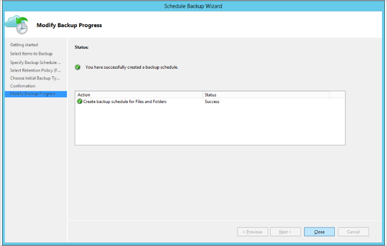 Wählen Sie Schließen aus, nachdem der Assistent die Erstellung des Sicherungszeitplans abgeschlossen hat.