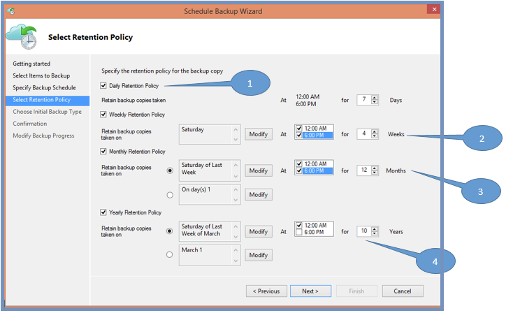 Die Aufbewahrung für tägliche und wöchentliche Wiederherstellungspunkte stimmt in der Regel mit dem Sicherungszeitplan überein. Wenn der Zeitplan also eine Sicherung auslöst, wird der Wiederherstellungspunkt (der vom Sicherungsvorgang erstellt wird) für die Dauer gespeichert, die die tägliche oder wöchentliche Aufbewahrungsrichtlinie angibt.