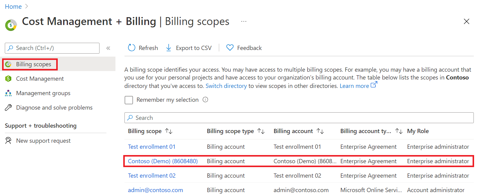 - Wenn Sie eine Azure-Supportanfrage für Ihre EA-Registrierung erstellen müssen, finden Sie weitere Informationen unter Erstellen einer Azure-Supportanfrage für ein Enterprise Agreement-Problem.