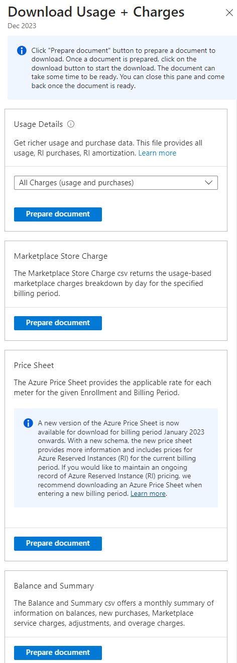 Herunterladen für den Monat aus. - Wählen Sie auf der Seite „Verbrauch + Gebühren“ unter dem Preisblatt Prepare document (Dokument vorbereiten) aus. Es kann eine Weile dauern, bis die Datei vorbereitet ist.