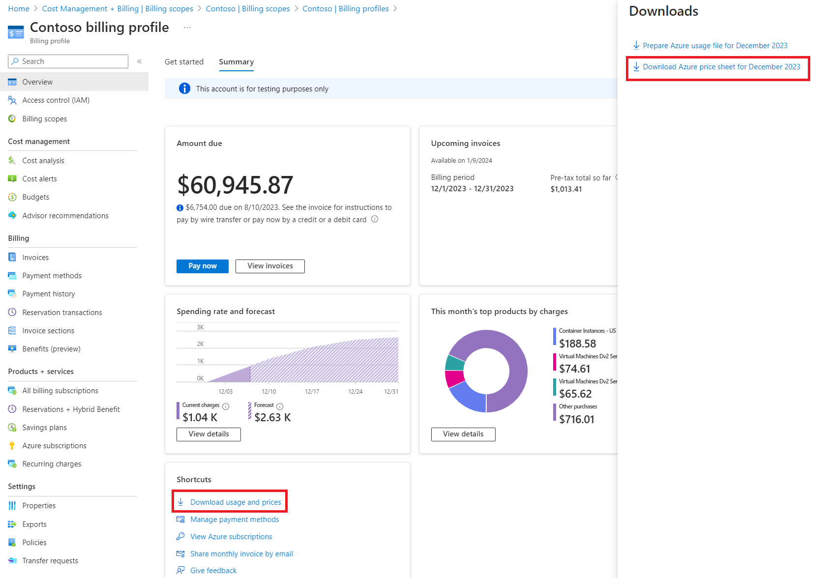 Wenn Sie über ein MCA verfügen, können Sie die Preise für den aktuellen Abrechnungszeitraum im Abrechnungsprofilbereich herunterladen.