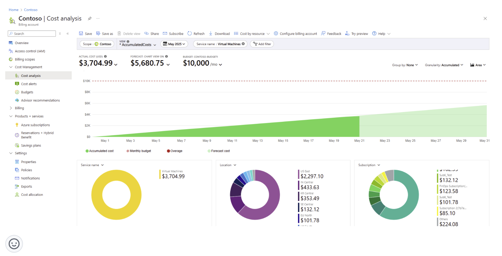 Wählen Sie " Kostenanalyse " im Menü auf der linken Seite des Bildschirms aus, um auf Berichte zuzugreifen, mit denen Sie Ihre aktuellen Kosten nach verschiedenen Pivots wie Tags, Dienst, Standort und Abonnement anzeigen können. Nachdem Sie einen Dienst hinzugefügt oder einen Kauf vorgenommen haben, wird empfohlen, 24 Stunden zu warten, bis die Daten angezeigt werden. Die Kostenanalyse zeigt standardmäßig die Kosten für den Bereich an, in dem Sie sich befinden. Im folgenden Screenshot werden beispielsweise die Kosten für das Contoso-Abrechnungskonto angezeigt. Verwenden Sie die Scope-Pille, um zu einem anderen Bereich in der Kostenanalyse zu wechseln. Weitere Informationen zu Bereichen finden Sie unter " Grundlegendes und Arbeiten mit Bereichen"