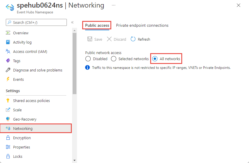 Beim Erstellen eines Namespace können Sie entweder nur öffentlichen Zugriff (aus allen Netzwerken) oder nur privaten Zugriff (nur über private Endpunkte) auf den Namespace zulassen. Nachdem der Namespace erstellt wurde, können Sie den Zugriff von bestimmten IP-Adressen oder aus bestimmten virtuellen Netzwerken (mithilfe von Netzwerkdienstendpunkten) zulassen.
