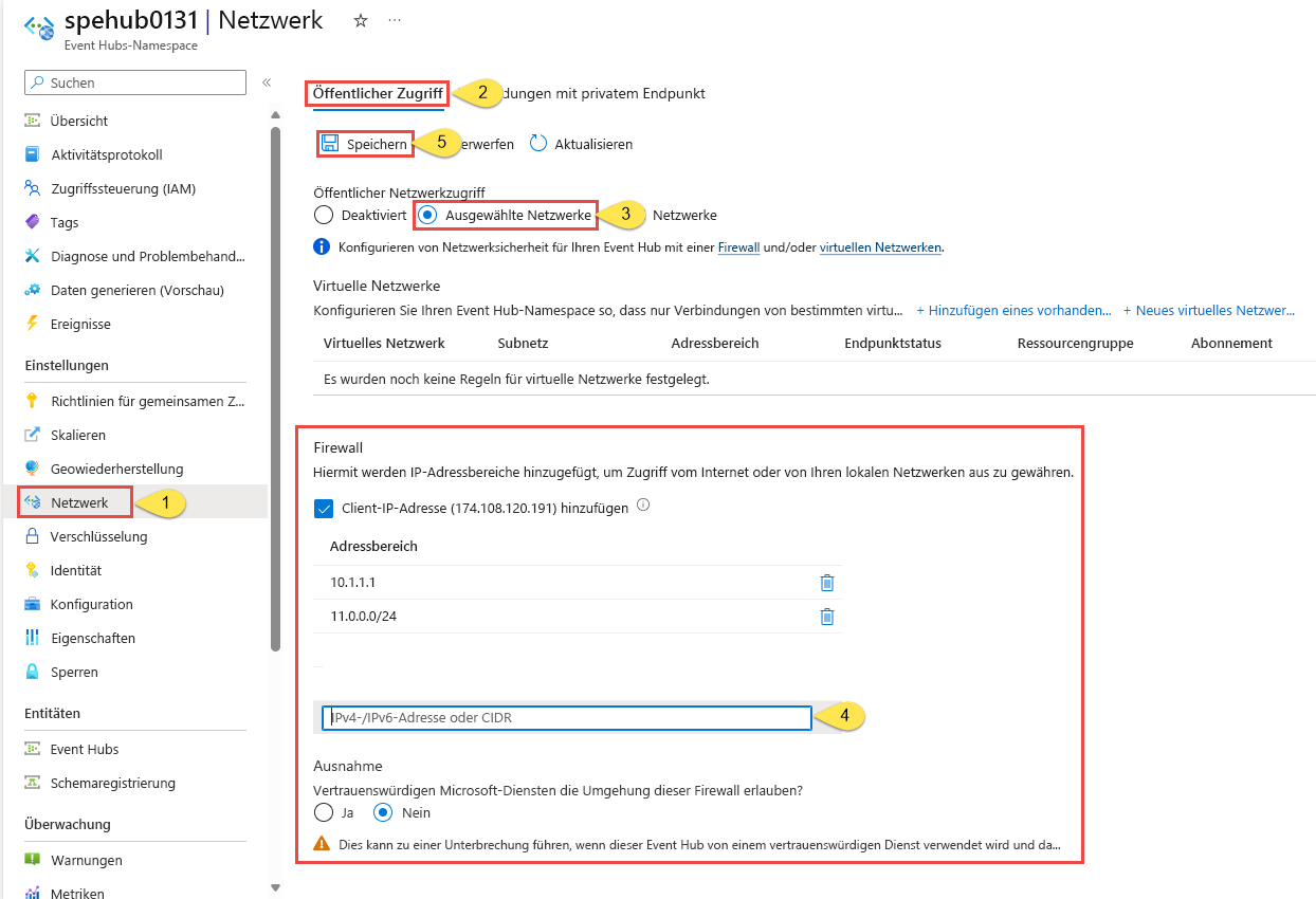 Ausgewählte Netzwerke: Diese Option ermöglicht den öffentlichen Zugriff auf den Namespace unter Verwendung eines Zugriffsschlüssels aus ausgewählten Netzwerken.