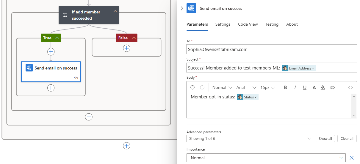 Hinweis: Wenn diese Ausgabe nicht angezeigt wird, wählen Sie neben dem Abschnittsnamen Mitglied zu Liste hinzufügenWeitere anzeigen aus.Text Ja < success-email-body> Der Inhalt der Erfolgs-E-Mail. Führen Sie für dieses Beispiel die folgenden Schritte aus: