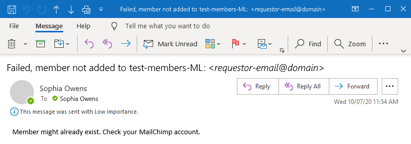 Sollte Ihr Workflow den Abonnenten nicht hinzufügen können, erhalten Sie eine E-Mail wie im folgenden Beispiel: