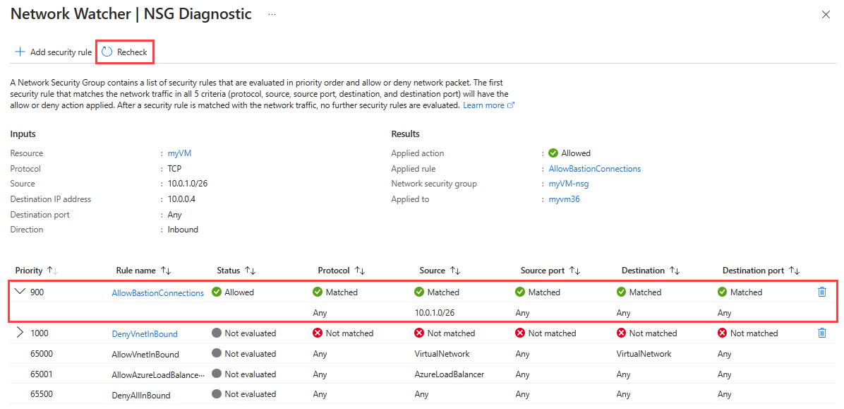 Wählen Sie Erneut überprüfen aus, um die Diagnosesitzung erneut auszuführen. In der Diagnosesitzung sollte nun anzeigen, dass der Datenverkehr aus dem Bastion-Subnetz zulässig ist.
