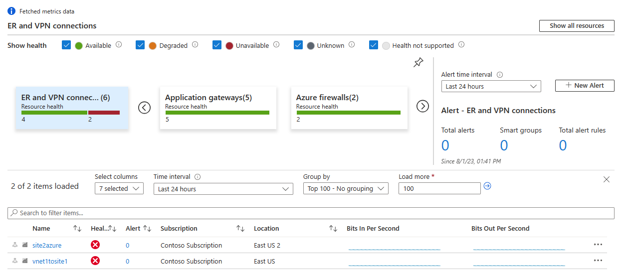 Wählen Sie auf der Kachel ER- und VPN-Verbindungen die nicht verfügbaren ExpressRoute- und VPN-Verbindungen aus, um ihre Metriken anzuzeigen: