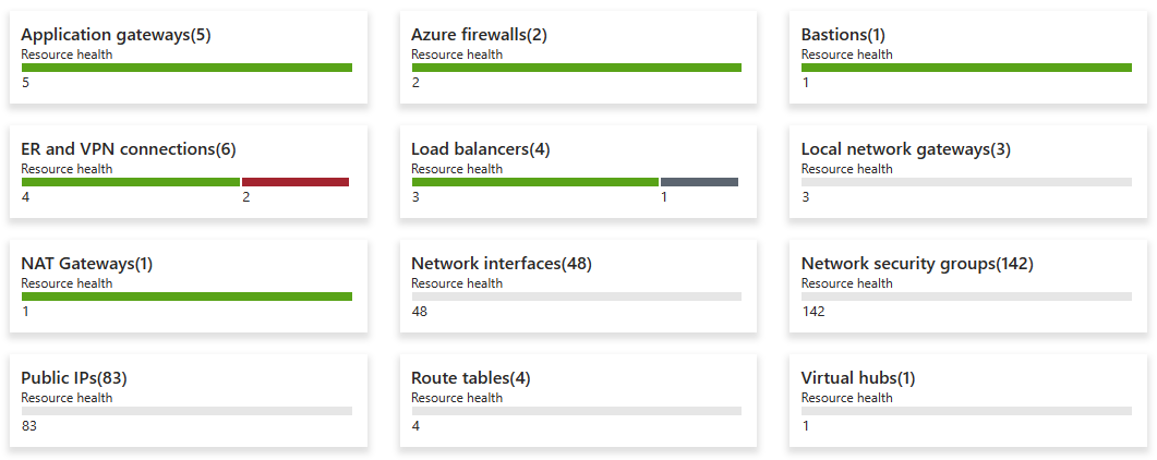 Auf der Registerkarte Netzwerkintegrität können Sie die Integrität und Metriken aller Ressourcen für ausgewählte Abonnements und Ressourcengruppen anzeigen. Jede Kachel stellt einen Ressourcentyp dar. Sie zeigt die Anzahl der Instanzen dieses Ressourcentyps an, die in den ausgewählten Abonnements und Ressourcengruppen bereitgestellt werden. Außerdem wird der Integritätsstatus der Ressource angezeigt. Im folgenden Beispiel werden 6 ExpressRoute- und VPN-Verbindungen bereitgestellt. Davon sind 4 fehlerfrei und 2 nicht verfügbar.