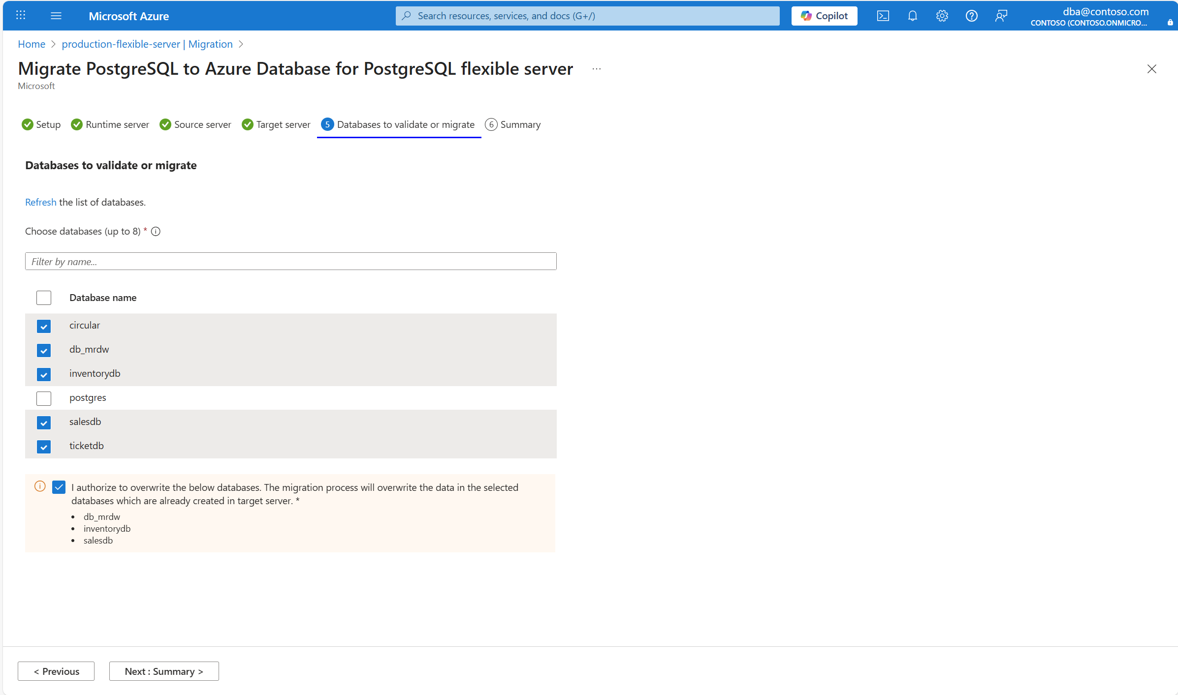 Unter der Registerkarte "Datenbanken zum Überprüfen oder Migrieren " können Sie eine Liste der Benutzerdatenbanken auswählen, die von Ihrem Quell-PostgreSQL-Server migriert werden sollen.