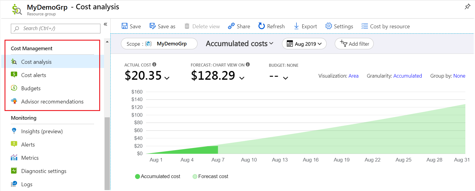 Im weiteren Verlauf können Sie aktuelle und prognostizierte Kosten für einzelne Ressourcen und für die gesamte Ressourcengruppe nachverfolgen. Im folgenden Screenshot werden die Kosteninformationen dargestellt, die verfügbar sind, wenn Sie mehrere Ressourcen in einer Gruppe kombinieren: