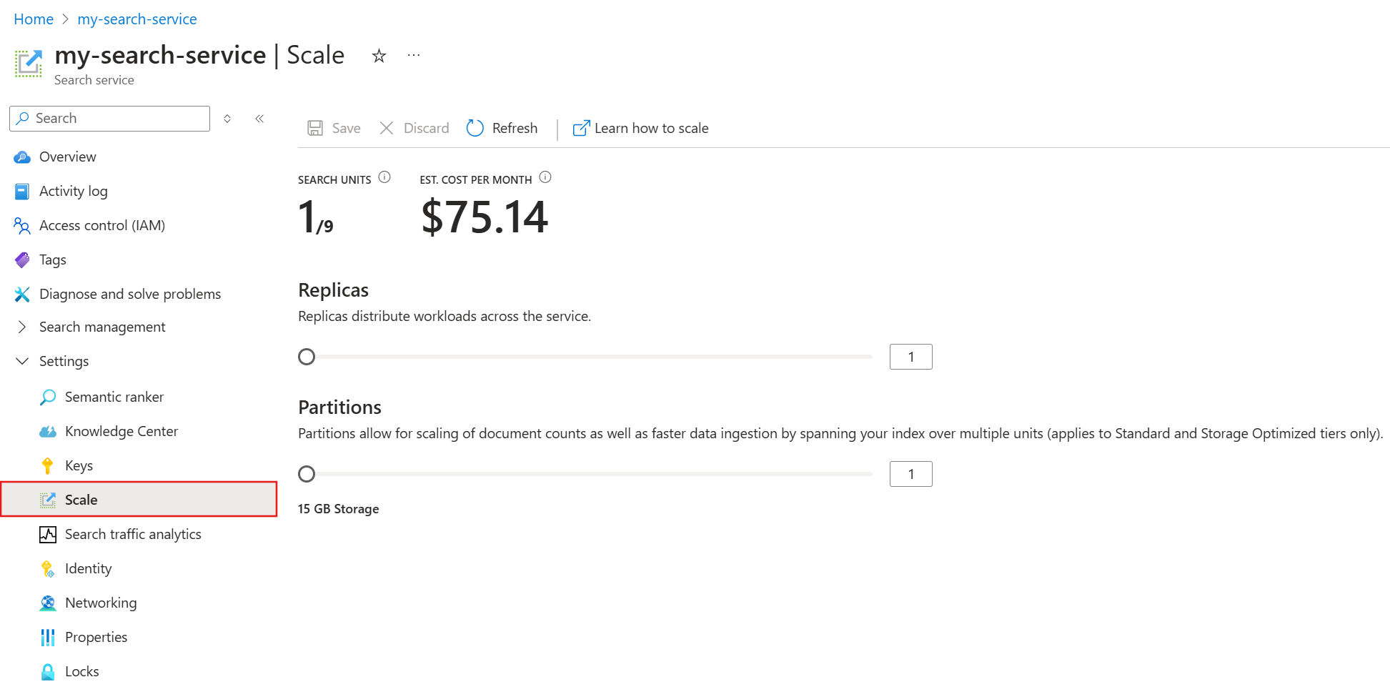 Nach der Bereitstellung des Suchdiensts können Sie ihn Ihren Anforderungen entsprechend skalieren. Azure KI-Suche bietet zwei Skalierungsdimensionen: Replikate und Partitionen. Replikate ermöglichen es Ihrem Dienst, eine größere Menge von Suchabfragen zu verarbeiten. Partitionen hingegen ermöglichen es Ihrem Dienst, mehr Dokumente zu speichern und zu durchsuchen.