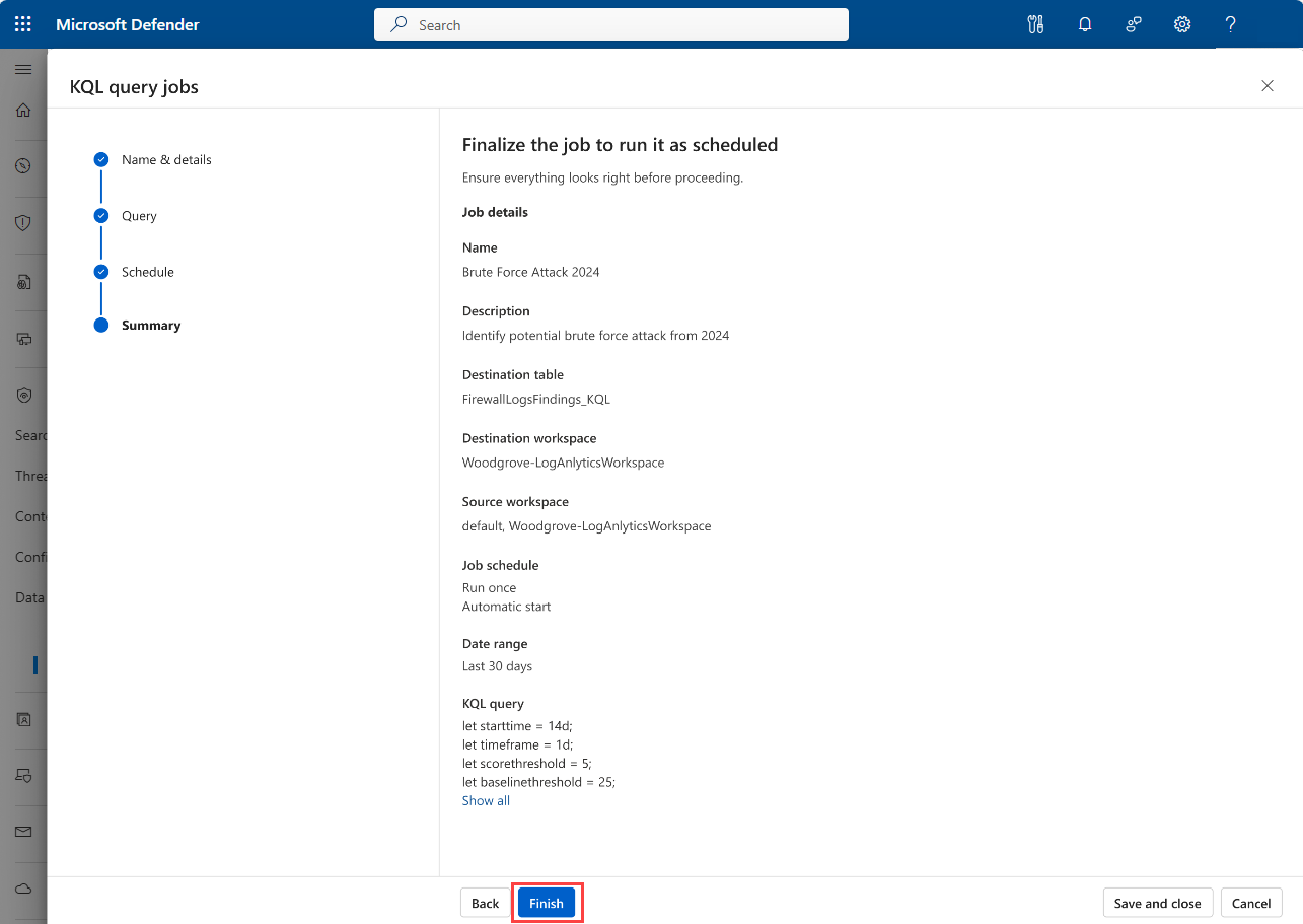 - Um einen Auftrag aus dem KQL-Abfrage-Editor zu erstellen, wählen Sie in der oberen rechten Ecke des Abfrage-Editors die Schaltfläche " Auftrag erstellen " aus.