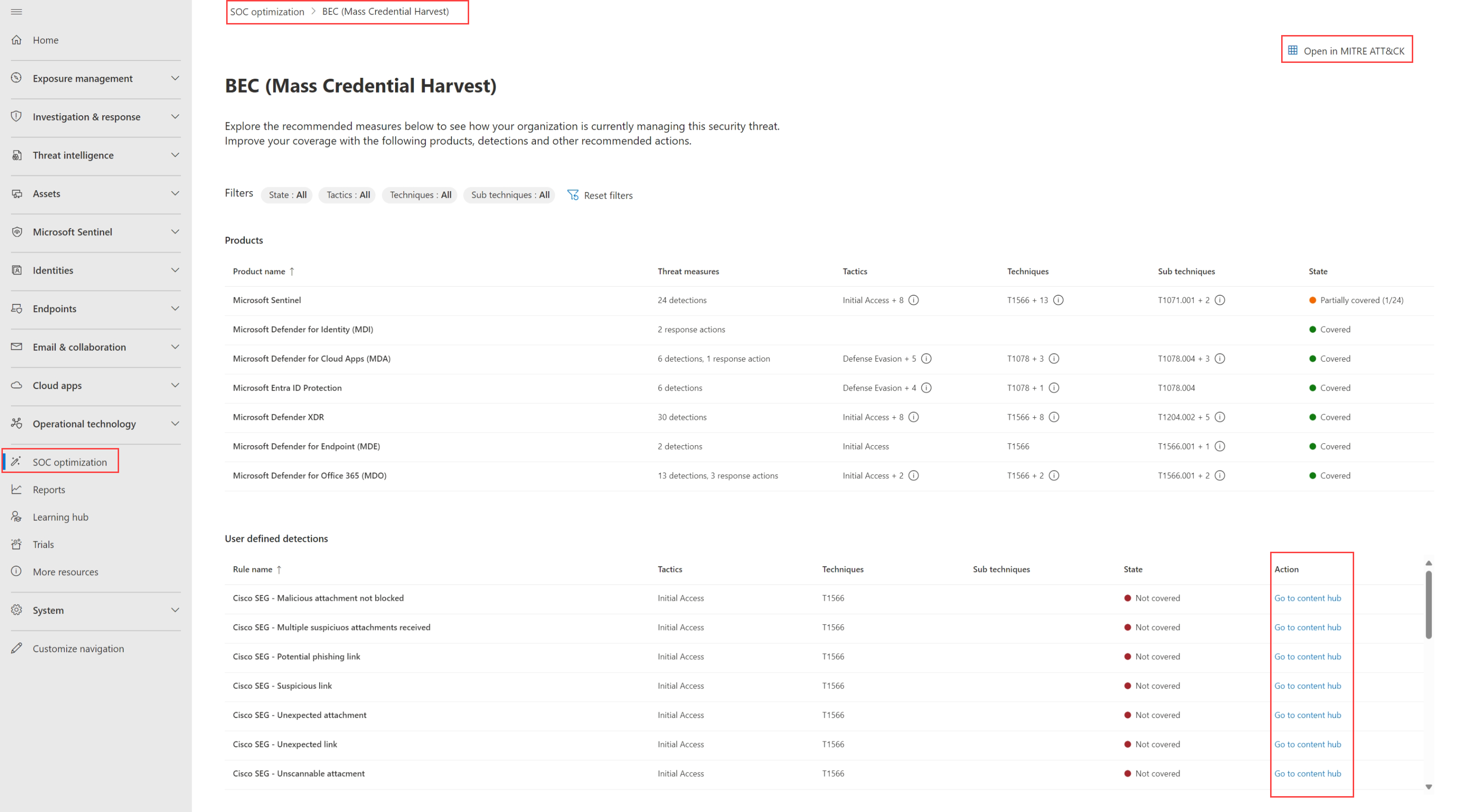 Wählen Sie für Optimierungen der bedrohungsbasierten Abdeckung das vollständige Bedrohungsszenario anzeigen aus, um die vollständige Liste der relevanten Bedrohungen, aktiven und empfohlenen Erkennungen und Abdeckungsebenen anzuzeigen. Von dort aus können Sie direkt zum Inhaltshub springen, um alle empfohlenen Erkennungen zu aktivieren, oder zur SEITE MITRE ATT&CK , um die vollständige MITRE ATT&CK-Abdeckung für das ausgewählte Szenario anzuzeigen. Beispiel: