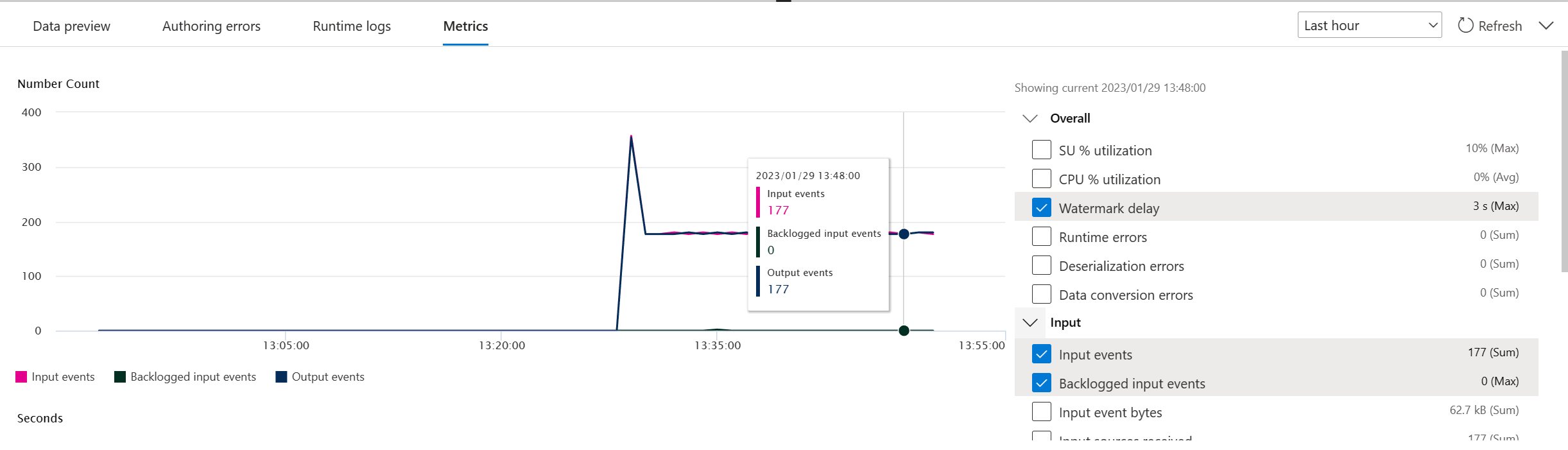 Wenn die Verbindung erfolgreich eingerichtet wurde und Datenströme bei Event Hubs eingehen, werden sofort zwei Dinge angezeigt: