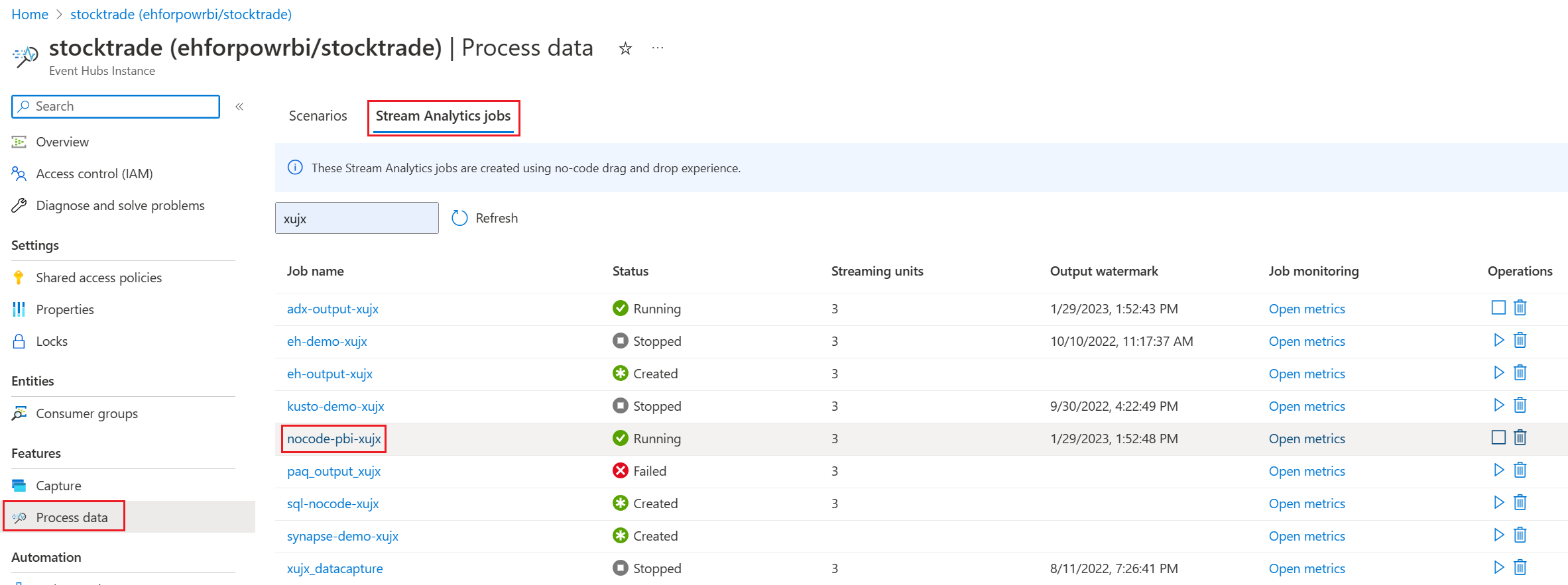 Sie können den Auftrag auch auf der Registerkarte Stream Analytics-Aufträge im Abschnitt „Daten verarbeiten“ anzeigen. Wählen Sie Metriken öffnen aus, um ihn zu überwachen oder bei Bedarf zu beenden und neu zu starten.