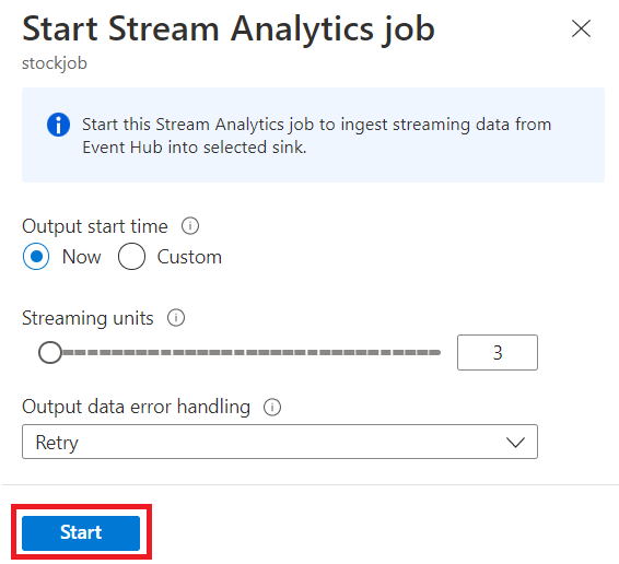 Wählen Sie Speichern und anschließend Starten aus, um den Stream Analytics-Auftrag zu starten.