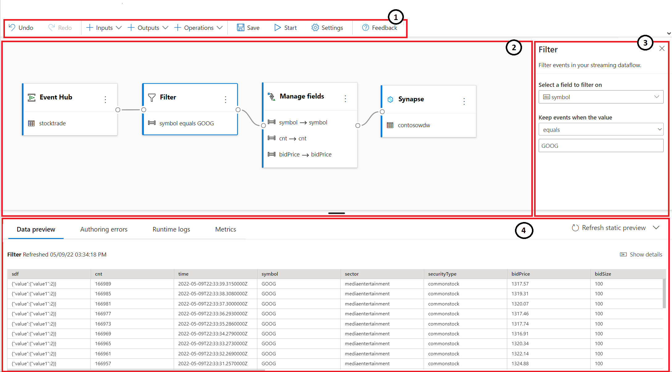 - Menüband: Die Abschnitte auf dem Menüband entsprechen der Reihenfolge eines klassischen Analyseprozesses: ein Event Hub als Eingabe (auch als Datenquelle bezeichnet), Transformationen (ETL-Streamingvorgänge – Extrahieren, Transformieren und Laden), Ausgaben, eine Schaltfläche zum Speichern und eine Schaltfläche zum Starten des Auftrags.