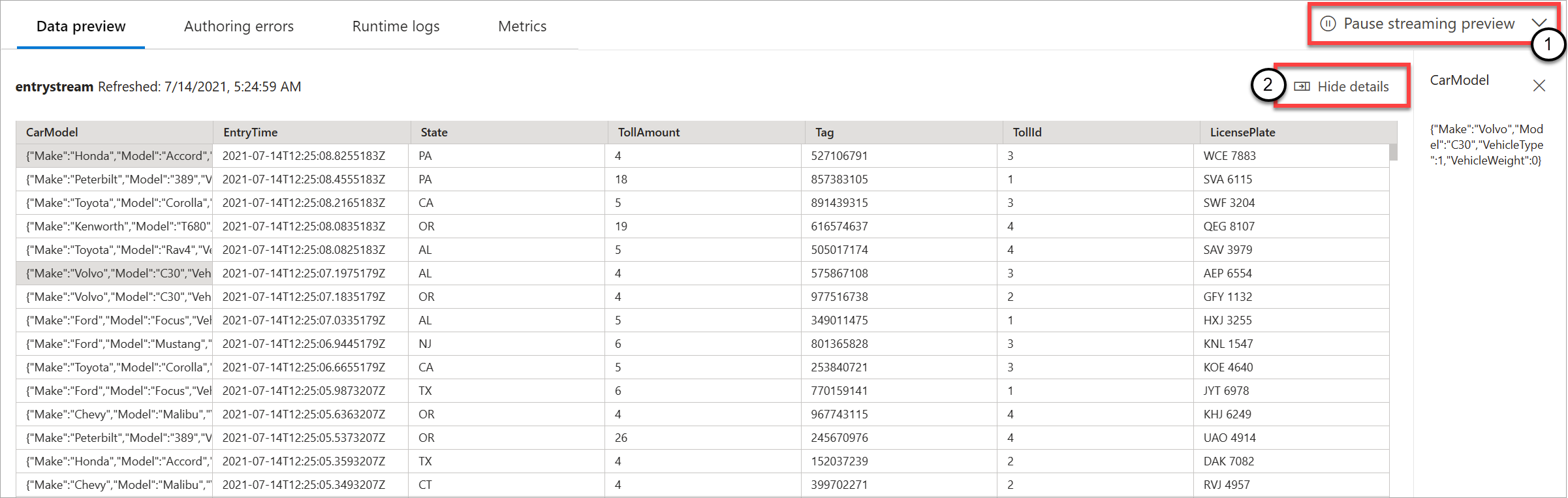Sie können die Vorschau aktualisieren, indem Sie Statische Vorschau aktualisieren (1) auswählen. Wenn Sie die Vorschau aktualisieren, übernimmt der Stream Analytics-Auftrag neue Daten aus der Eingabe und wertet alle Transformationen aus. Dann sendet sie die Ausgabe erneut mit allen Aktualisierungen, die Sie möglicherweise vorgenommen haben. Die Option Details ein-/ausblenden ist ebenfalls verfügbar (2).