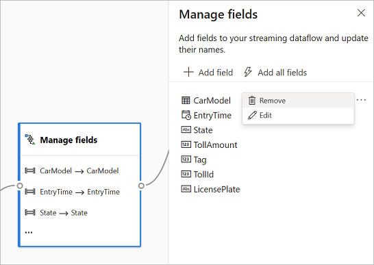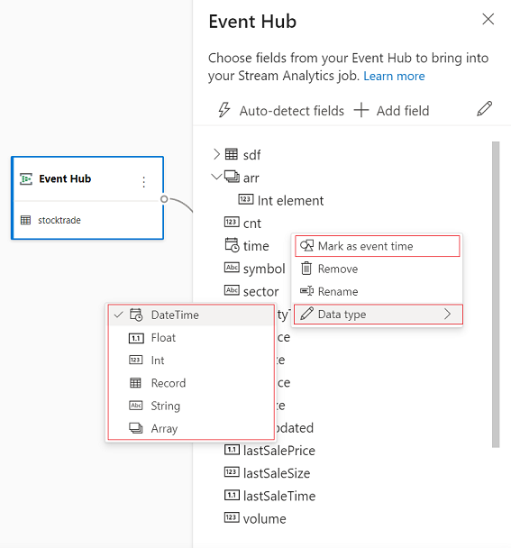 Sie können die Feldnamen bearbeiten, das Feld entfernen bzw. den Datentyp oder die Ereigniszeit ändern (Markieren als Ereigniszeit: TIMESTAMP BY-Klausel, wenn es sich um ein Feld vom Typ „datetime“ handelt), indem Sie das Symbol mit den drei Punkten neben jedem Feld auswählen. Sie können auch geschachtelte Felder aus den eingehenden Nachrichten erweitern, auswählen und bearbeiten, wie in der folgenden Abbildung dargestellt.