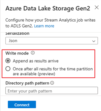 Zustellung vom Typ „Genau einmal“ (Vorschau) wird in ADLS Gen2 als Ausgabe des No-Code-Editors unterstützt. Das Feature kann im Abschnitt Schreibmodus der ADLS Gen2-Konfiguration aktiviert werden. Weitere Informationen zu diesem Feature finden Sie unter Zustellung vom Typ „Genau einmal“ (Public Preview).