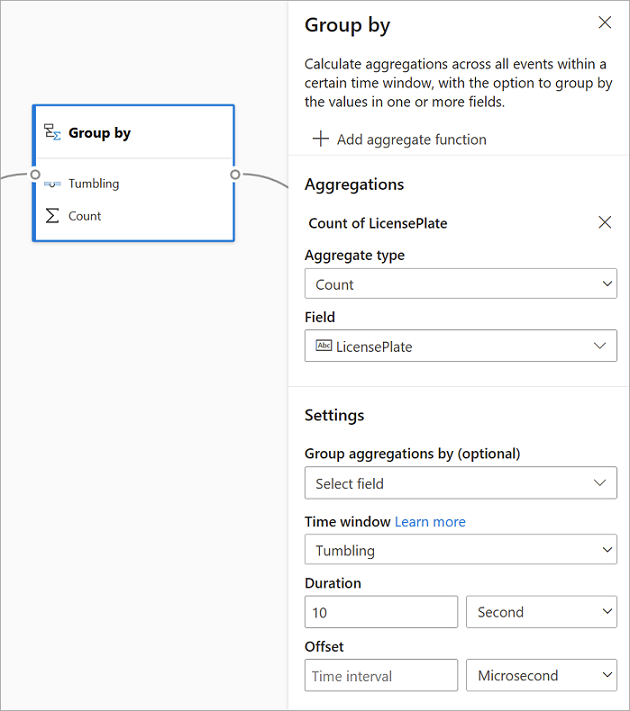 Um der gleichen Transformation eine weitere Aggregation hinzuzufügen, wählen Sie Aggregatfunktion hinzufügen aus. Beachten Sie, dass sich das Feld Gruppieren nach und die Zeitfensterfunktion auf alle in der Transformation enthaltenen Aggregationen beziehen.