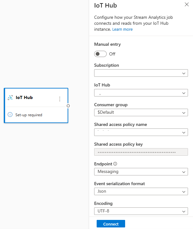 Um einen IoT Hub als Streamingeingabe für Ihren Auftrag hinzuzufügen, wählen Sie IoT Hub unter Eingaben auf dem Menüband aus. Geben Sie dann die erforderlichen Informationen im rechten Bereich ein, um IoT Hub mit Ihrem Auftrag zu verbinden. Weitere Informationen zu den Details der einzelnen Felder finden Sie unter Streamen von Daten vom IoT Hub zum Stream Analytics-Auftrag.