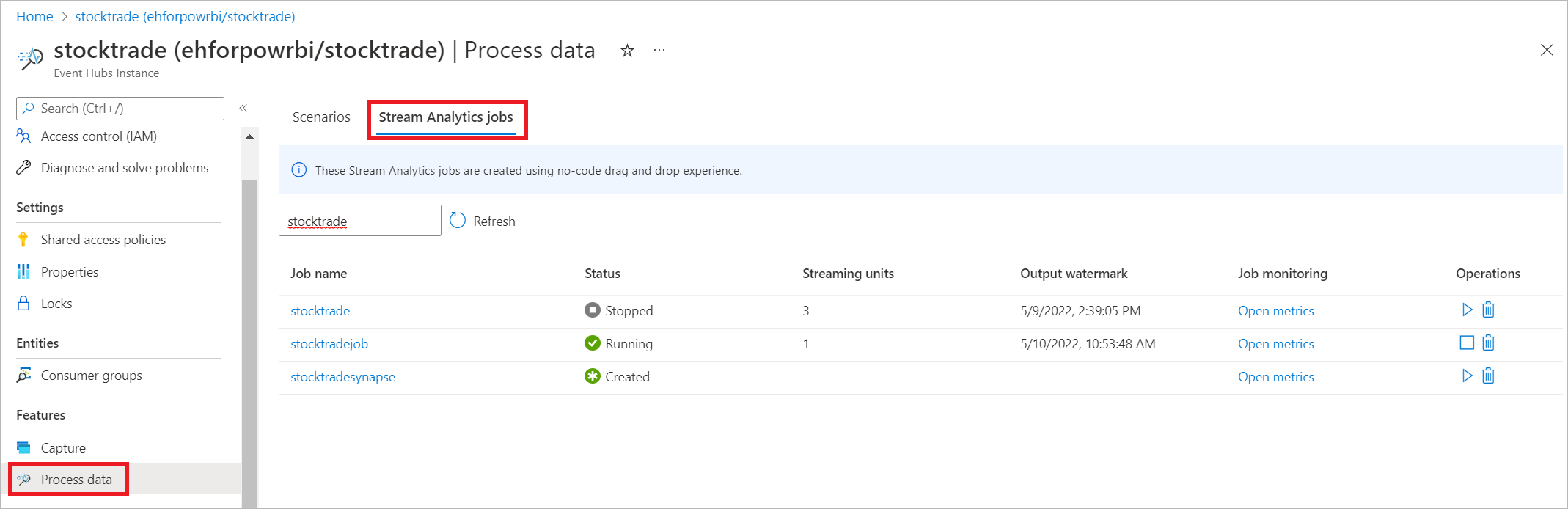 Um eine Liste aller Stream Analytics-Aufträge anzuzeigen, die Sie mithilfe der Drag & Drop-Funktion ohne Code im Azure Event Hubs-Portal erstellt haben, wählen Sie Daten verarbeiten>Stream Analytics-Aufträge aus.