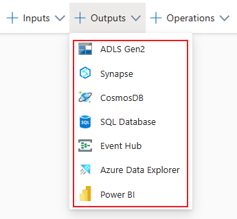- Die folgenden Ausgabetypen sind nicht verfügbar: Azure-Funktion, ADLS Gen1, PostgreSQL DB, Service Bus-Warteschlange/-Thema, Tabellenspeicher.