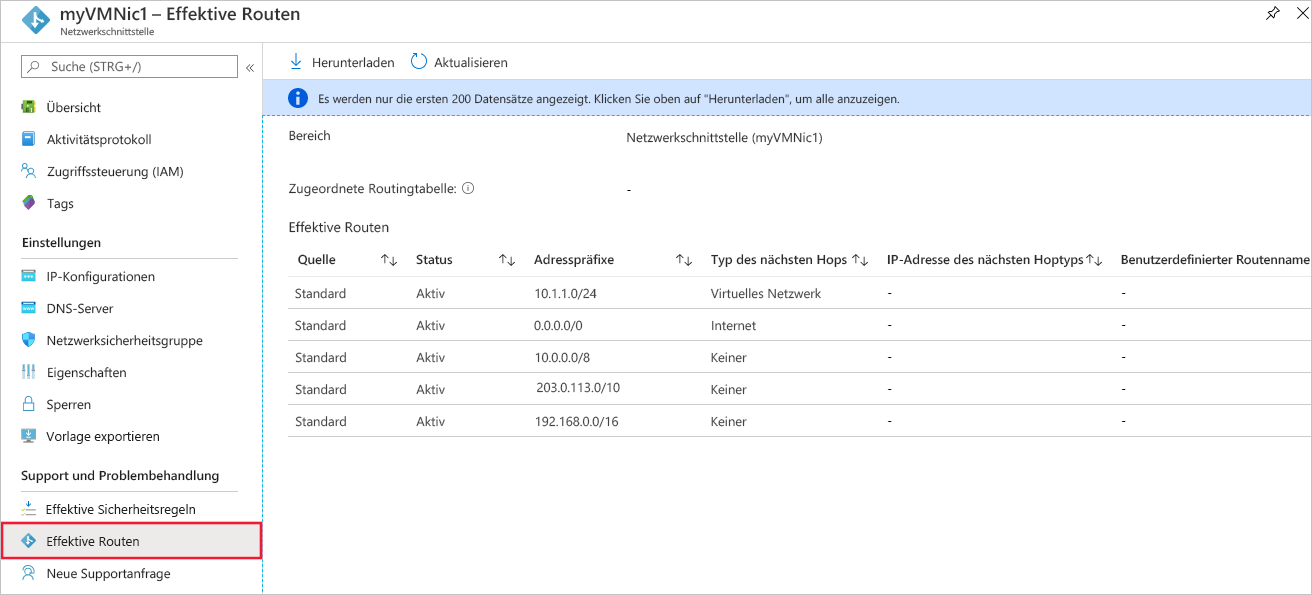 Wählen Sie die gewünschte Netzwerkschnittstelle aus, um die effektiven Routen anzuzeigen. Jede Schnittstelle gehört möglicherweise zu einem anderen Subnetz, was zu eindeutigen Routen führt. Das Beispiel in der Abbildung zeigt Standardrouten, die von Azure für jedes Subnetz erstellt wurden. Ihre Liste enthält die Standardrouten und kann auch zusätzliche Routen enthalten. Die Routen können von Features wie virtuellem Netzwerkpeering oder Verbindungen zu lokalen Netzwerken über ein Azure-VPN-Gateway stammen. Ausführliche Informationen zu den Routen finden Sie unter Routing für virtuelle Netzwerke. Wenn viele Routen vorhanden sind, verwenden Sie die Option "Herunterladen ", um sie als .csv Datei zu speichern, um die Überprüfung zu erleichtern.