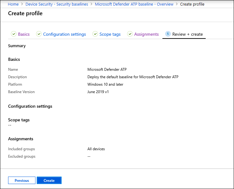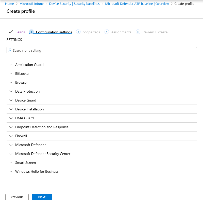 Übersicht über Microsoft Defender for Endpoint Sicherheitsbaseline in IntuneWährend der Profilerstellung können Sie bestimmte Einstellungen für die Baseline überprüfen und anpassen.