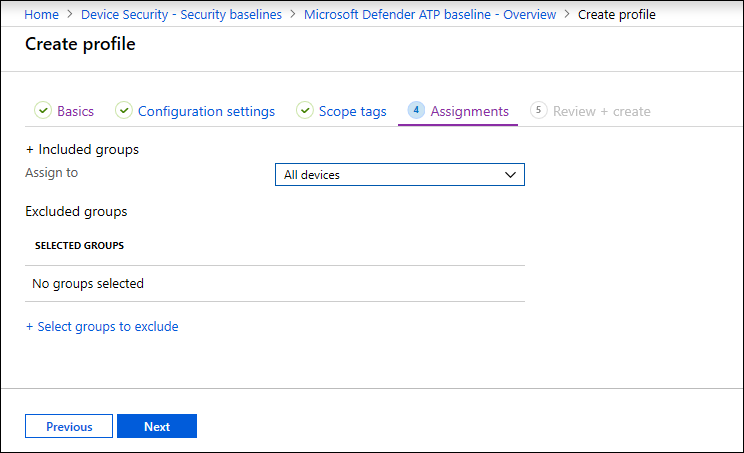Sicherheitsbaselineoptionen während der Profilerstellung in IntuneWeisen Sie das Profil der entsprechenden Gerätegruppe zu.