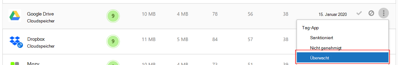 Der Microsoft Defender for Cloud Apps/Cloud-App-Katalog identifiziert Apps, bei denen Endbenutzer beim Zugriff mit Microsoft Defender XDR für Endpunkt gewarnt werden sollen, und markieren sie als Überwacht. Die unter überwachten Apps aufgeführten Domänen werden später mit Microsoft Defender XDR für Endpunkt synchronisiert: