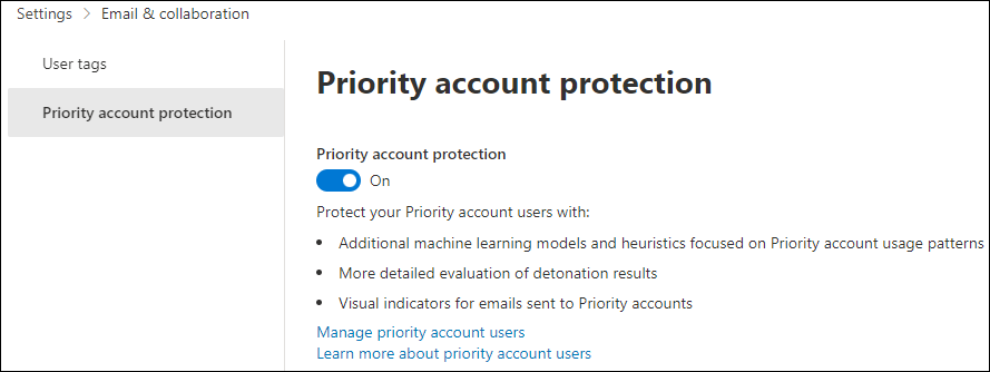 Das Priority-Kontotag ist ein Typ von Benutzertag. Sie können benutzerdefinierte Benutzertags erstellen, um bestimmte Benutzergruppen in der Berichterstellung und anderen Features zu unterscheiden. Weitere Informationen zu Benutzertags finden Sie unter Benutzertags in Microsoft Defender for Office 365.