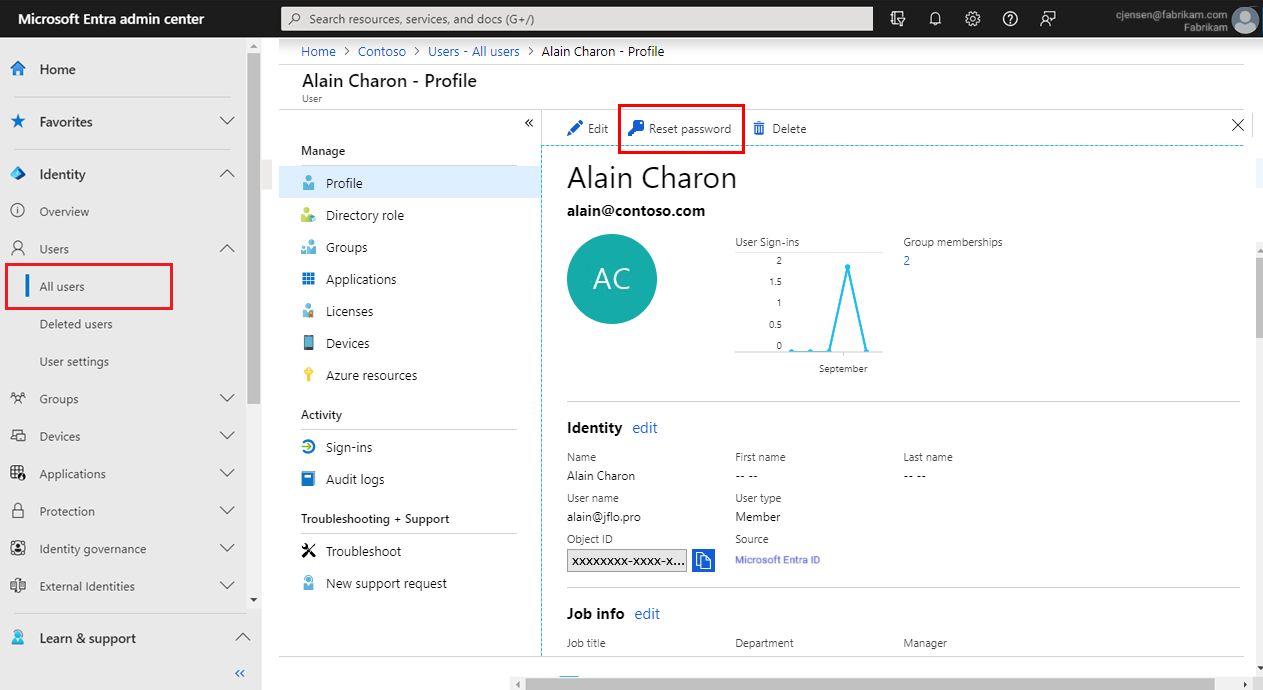 Wenn Ihr Benutzer über eine Autoritätsquelle als externe Microsoft Entra-ID verfügt, können Sie das Kennwort nicht zurücksetzen. Nur der Benutzer oder ein Administrator in diesem Mandanten kann das Kennwort zurücksetzen.