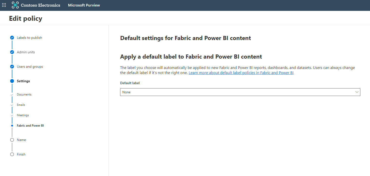 Ein Microsoft 365-Administrator kann eine Standardbezeichnungsrichtlinie für Fabric und Power BI aktivieren, indem er im Dropdownmenü "Diese Standardbezeichnung auf Power BI-Inhalte anwenden" in den Richtlinieneinstellungen für Power BI im Microsoft Purview-Complianceportal die gewünschte Bezeichnung auswählt. Weitere Informationen finden Sie unter Wirkung von Vertraulichkeitsbezeichnungen.