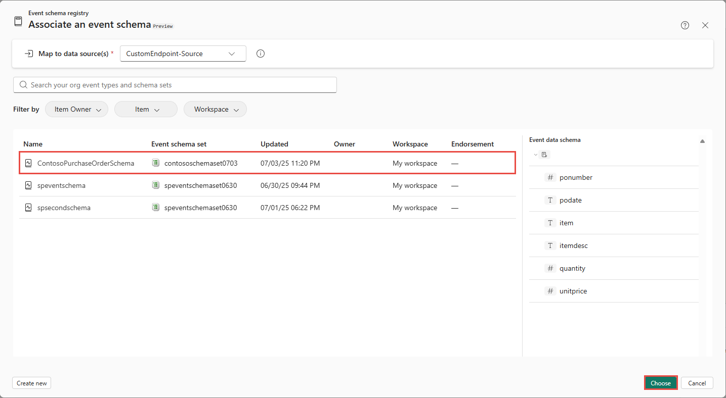Wählen Sie "Auswählen" , um das Ereignisschema dem benutzerdefinierten Endpunkt zuzuordnen.