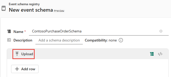 Wenn Sie über eine JSON-Schemadatei verfügen, wählen Sie "Hochladen " aus, um die Datei hochzuladen. Eine Beispieldatei finden Sie unter Herunterladen eines Ereignisschemas.