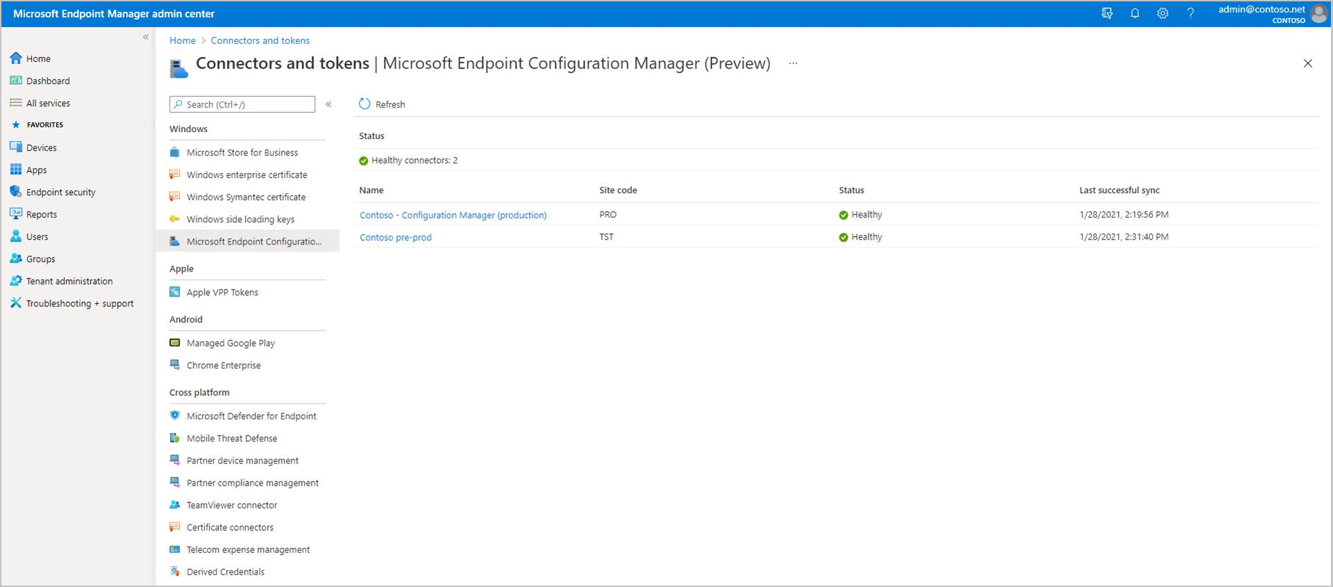 Im Microsoft Intune Admin Center können Sie die status Ihres Configuration Manager-Connectors überprüfen. Um den Connectorstatus anzuzeigen, wechseln Sie zu Mandantenverwaltung>Connectors und Token>Microsoft Endpoint Configuration Manager. Wählen Sie eine Configuration Manager-Hierarchie aus, um zusätzliche Informationen darüber anzuzeigen.